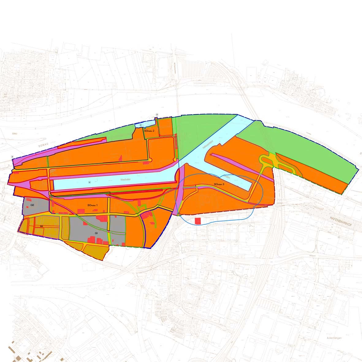 Mithilfe dieser Bauleitplanungen soll die städtebauliche Entwicklung von in Konflikt miteinander und zueinander stehenden Nutzungen am Regensburger Westhafen/Ölhafen (133 ha) unter besonderer Berücksichtigung der sich wirtschaftlich positiv entwickelnden hafenaffinen Nutzungen gesteuert und gesichert werden. Im Vordergrund stehen dabei Insbesondere die Belange der Wohnbebauung in der unmittelbaren Umgebung, die Beachtung des Hochwasserschutzes, die Erfordernisse einer nachhaltigen sicherheitstechnischen Entflechtung eines Störfallbetriebes in Form eines Tanklagers sowie die Belange des Schutzes vor Schallimmissionen sowie eine optimierte verkehrliche Anbindung. Wir erarbeiten die erforderlichen Unterlagen und koordinieren die Verfahren zur Aufstellung des Bebauungsplans und zur Änderung des Flächennutzungsplans.