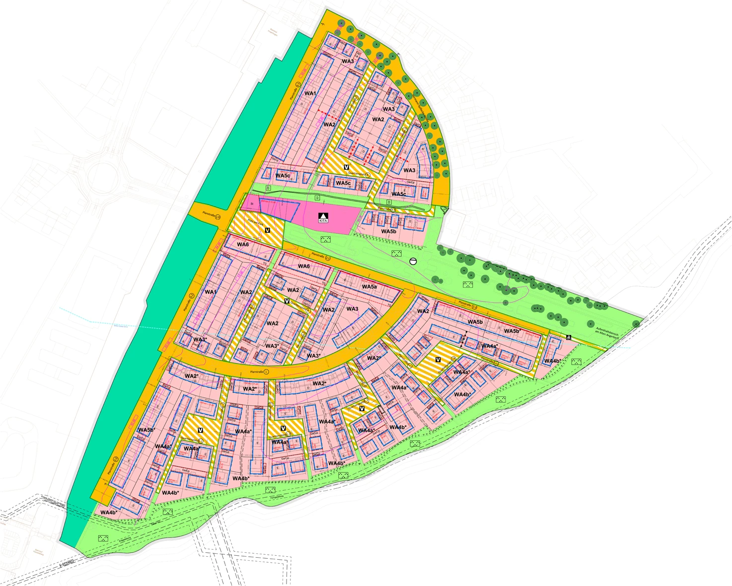Geplant ist ein attraktives Gebiet mit etwa 320 Wohneinheiten – überwiegend Einfamilienhäuser und vereinzelte Mehrfamilienhäuser sowie eine Kindertagesstätte. Das Zentrum des Gebiets wird durch einen öffentlichen linearen Park gebildet. Von diesem aus wird ein feinmaschiges Netz von Grünverbindungen entwickelt. Durch das Freiraumsystem wird das Entwicklungsgebiet in fünf Quartiere gegliedert, die gut erlebbare öffentliche Räume und durch eine individuelle Gestaltung auch einen hohen Wiedererkennungswert aufweisen.