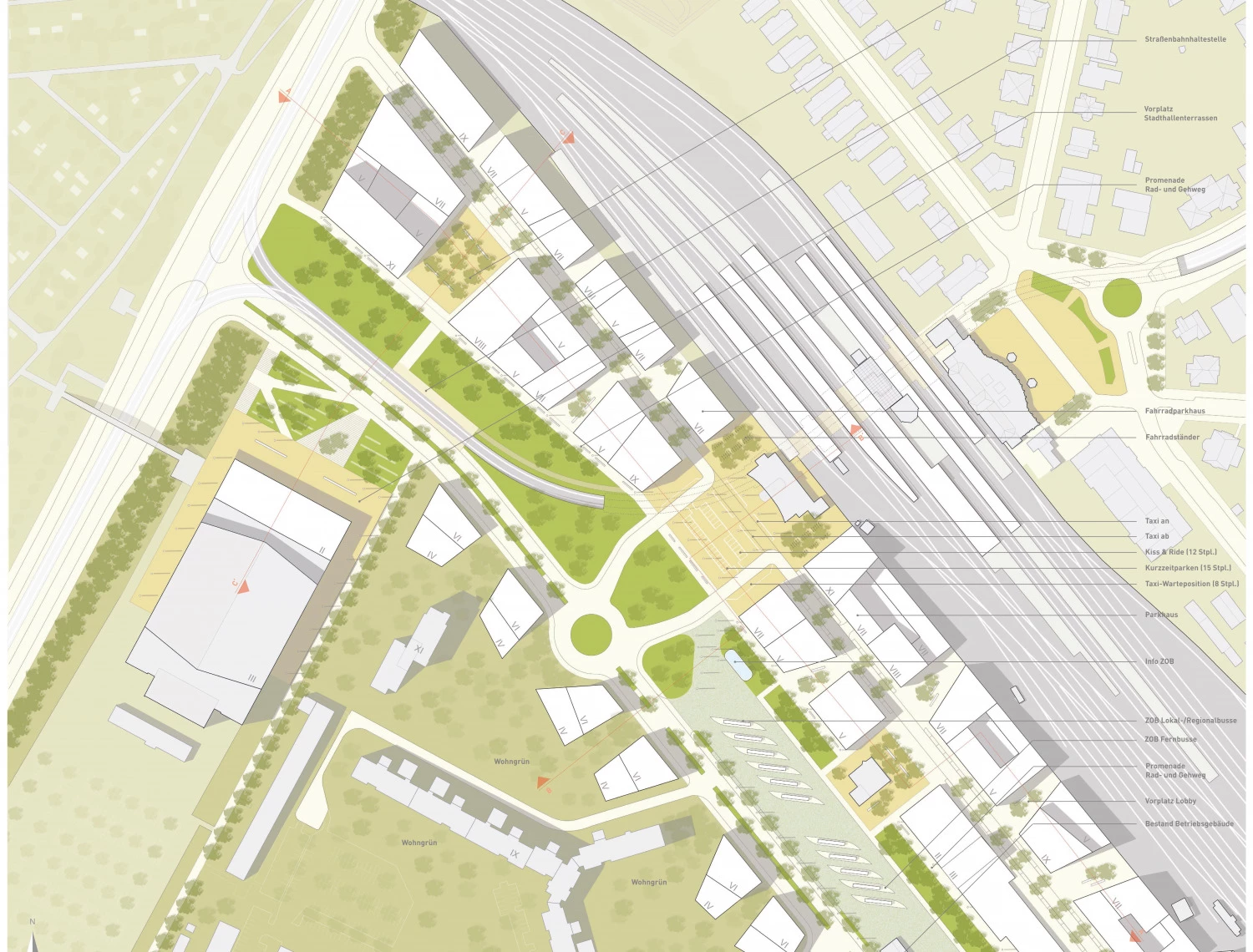 In diesem Konzept wird der Bereich südlich der Bahnanlagen als neues Quartier entwickelt und neu geordnet. Die neue Bebauung wird zum Integralen Bestandteil der umgebenden Stadtstruktur und bildet gleichzeitig ein neues Quartier mit eigener Identität. Dabei wird der Städtebau als eine Art räumliche Regie verstanden. Das heißt, es wird kein fertig’ durchgestaltetes Konzept vorgeschlagen, sondern eine Entwicklungsstrategie für die Gestaltung städtebaulicher und architektonischer Einzelbausteine. Dies geschieht durch die intensive Verschränkung urbaner und stadtlandschaftlicher Elemente. Ziel ist es, einen – auch wirtschaftlich – tragfähigen stadtlandschaftlichen und städtebaulichen Rahmen zu definieren. Dieser bietet Raum für die Realisierung eines hoch qualitätsvollen, intensiv durchmischten und lebendigen neuen Stadtquartiers für unterschiedliche Nutzergruppen und definiert eine klare städtebauliche Gestalt mit vielfältigen Möglichkeiten der architektonischen Entwicklung.