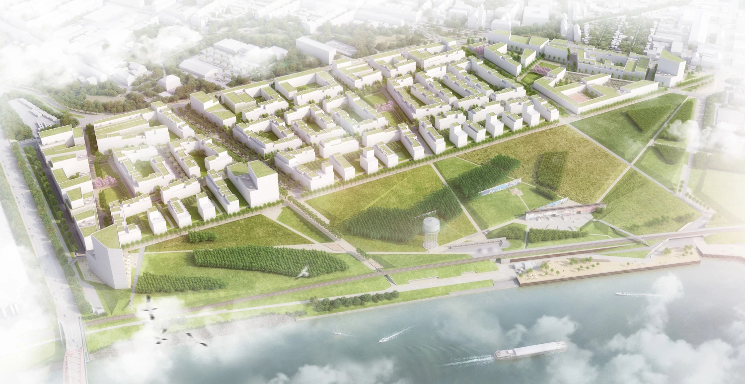 Jedoch macht nicht nur die Bodensanierung das Projekt ‚RheinOrt‘ zu einem Vorzeigeprojekt der Stadtplanung und Transformation, sondern insbesondere der integrierte städtebaulich-freiraumplanerische Entwurf für eine autofreie ‚15-Minuten Stadt‘ mit einer Mischung aus Wohnen, Arbeiten und Soziales. Gleichzeitig ist der städtebaulich-freiraumplanerische Entwurf so robust konzipiert, dass den Herausforderungen des Klimawandels und der Mobilitätswende stark entgegengetreten werden kann – u.a. wird das Niederschlagswasser im Sinne eines Schwammstadtkonzepts bewirtschaftet und der Modal Split auf nachhaltige Verkehrsmittel verlagert.